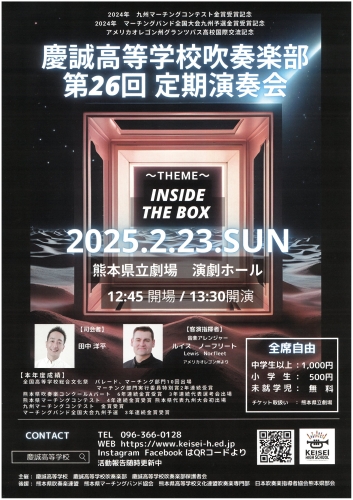 お知らせ 2025.01.25 当スタジオのご利用者様からのお知らせです。 慶誠高等学校吹奏楽部 第26回 定期演奏会 日時:2025年2月23日 12:45開場/13:30開演 場所:熊本県立劇場 演劇ホール 詳細は添付写真をご覧ください。 ご来場お待ちしております!